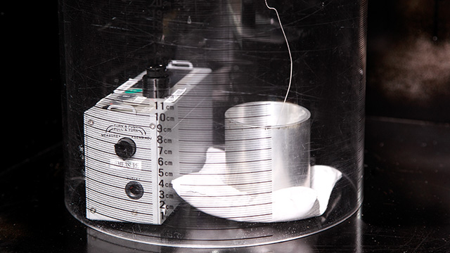 シリンダーにミニふとんを入れる。その上部30cmの位置より、1kgの錘を落下させほこりを発生させる。